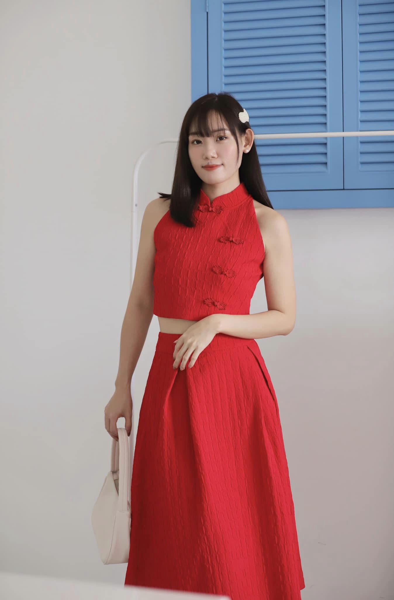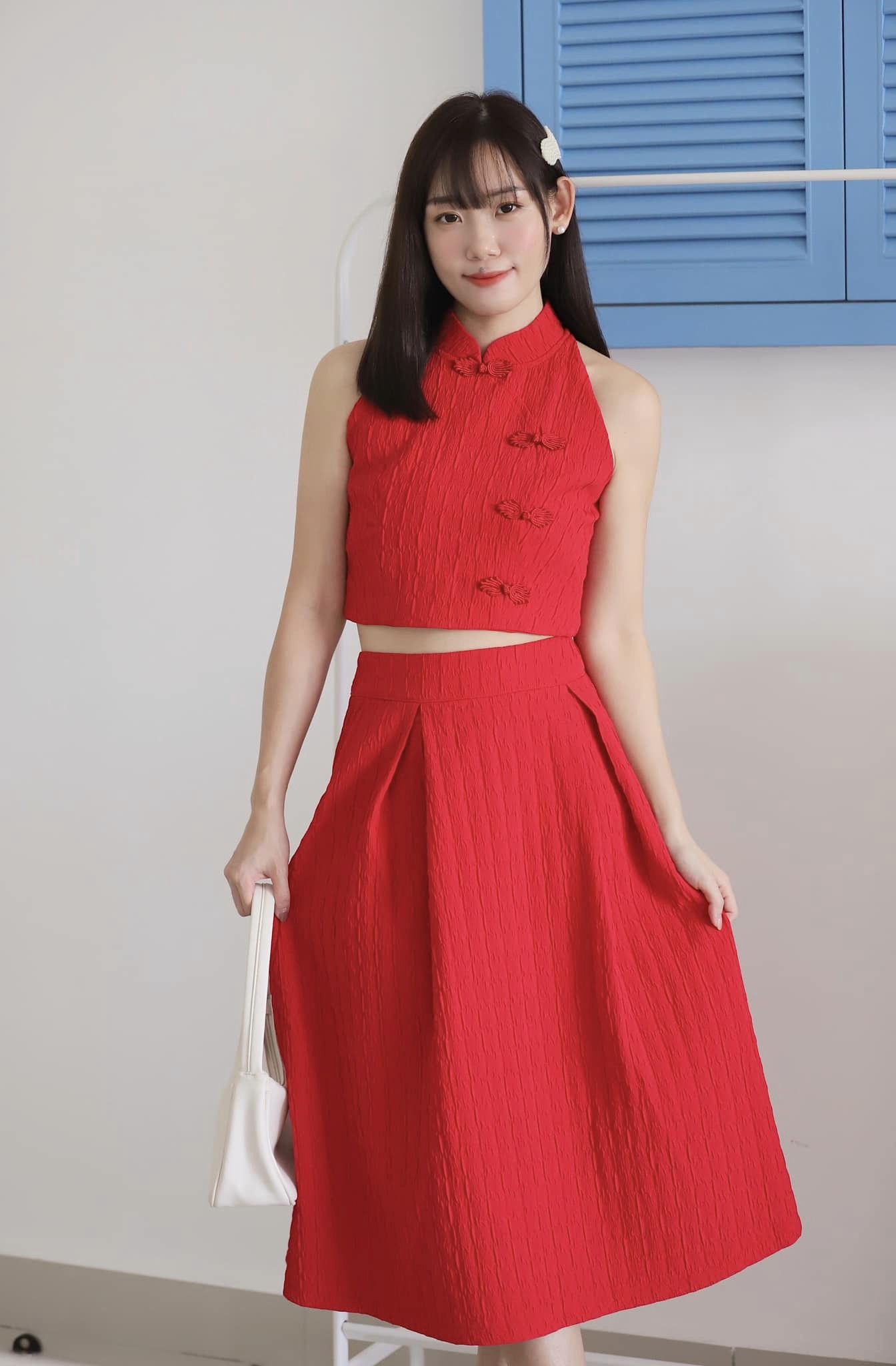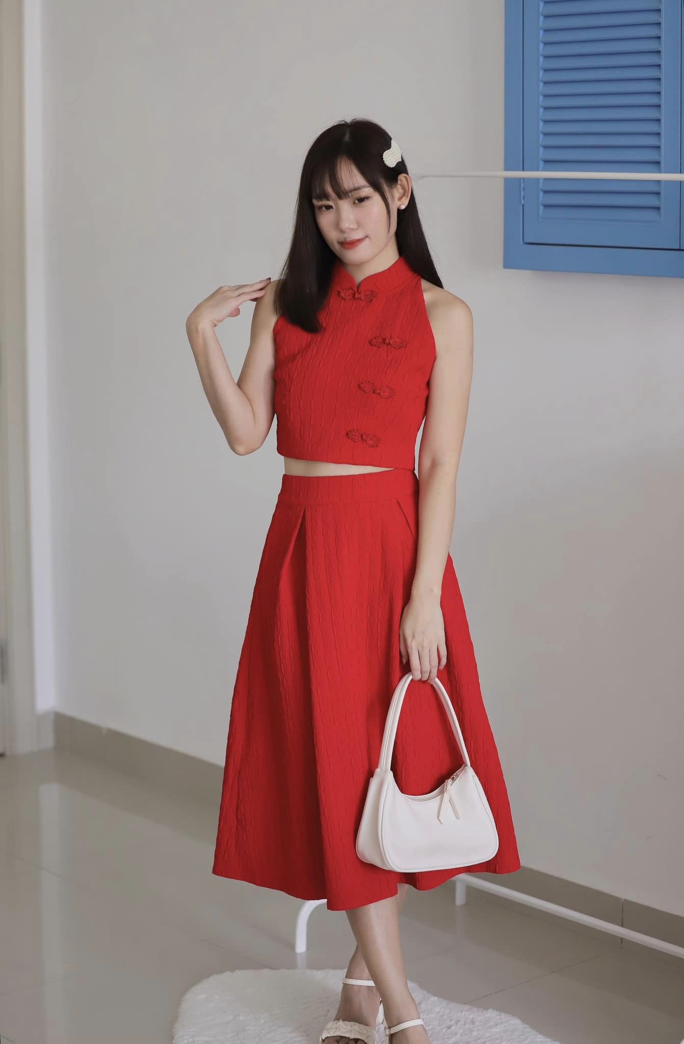 This sleeveless halterneck Chinese-style top features a back zip and a perfect overskirt. It hides all your thigh fat and makes you look taller and slimmer.